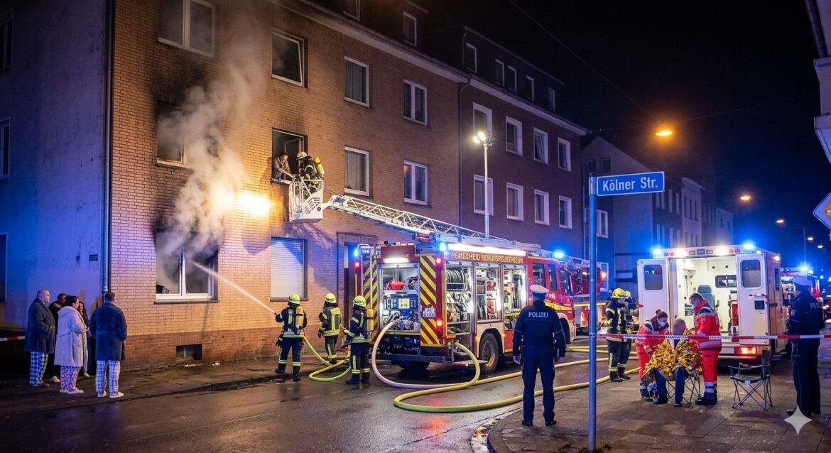 Remscheid (ots) – Am späten Montagabend gegen 23:37 Uhr wurde die Feuerwehr Remscheid zu einem Brand in einem Mehrfamilienhaus an der Kölner Straße alarmiert. Bei Eintreffen der ersten Kräfte bestätigte sich ein Zimmerbrand in einer Erdgeschosswohnung. Da bereits dichter Rauch in den Treppenraum eingedrungen war, war den Bewohnern der darüberliegenden Etagen der Fluchtweg abgeschnitten. Die Feuerwehr leitete umgehend eine umfassende Menschenrettung ein. Während zwei Trupps unter Atemschutz im Innenbereich vorgingen, wurde eine Person im Außenbereich über eine Drehleiter in Sicherheit gebracht. Parallel dazu wurde die Brandbekämpfung in der Brandwohnung durchgeführt. Im Anschluss an die Brandbekämpfung wurde das Gebäude belüftet. Die Brandwohnung selbst ist vorerst unbewohnbar. Insgesamt versorgte der Rettungsdienst vor Ort vier leicht verletzte Personen, von denen zwei zur weiteren Behandlung in Krankenhäuser transportiert wurden. Die Feuerwehr Remscheid war mit 36 Einsatzkräften und 11 Fahrzeugen der Berufsfeuerwehr, der Löscheinheit Lennep sowie des Rettungsdienstes im Einsatz.